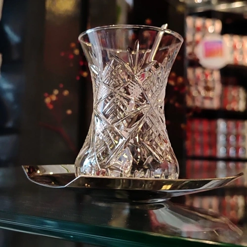 • İnce Belli Göz Dekor Çelik Tabaklı Çay Takımı - 6 Kişilik,18 Parça